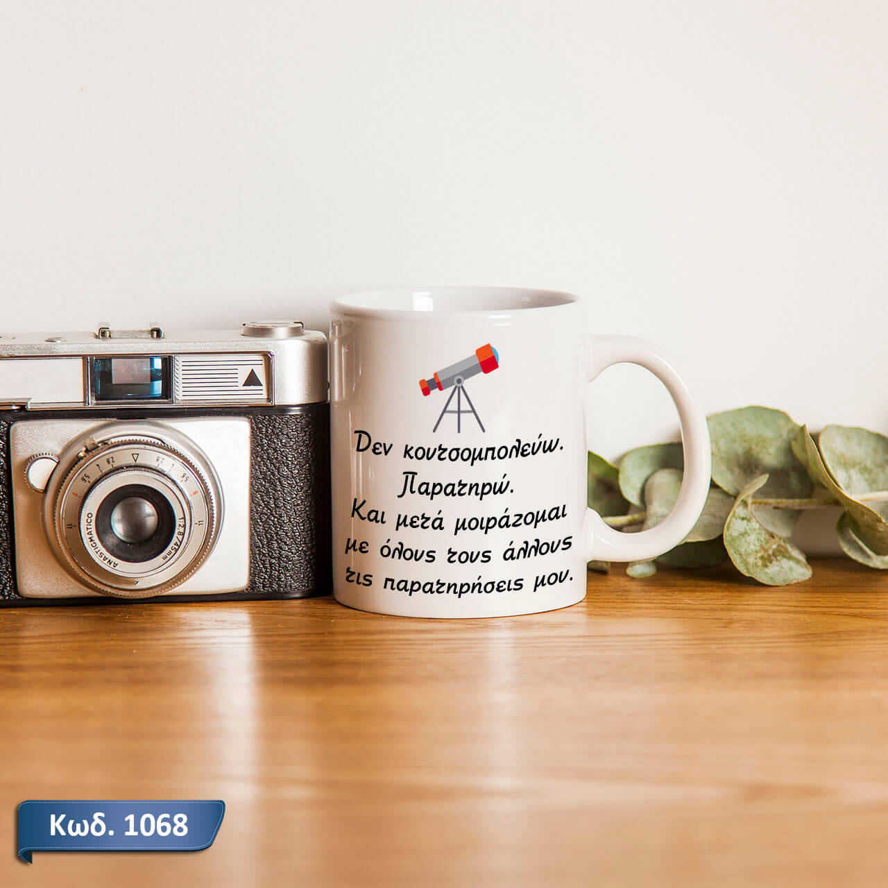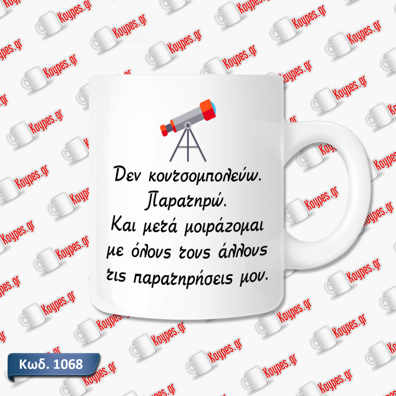 Κούπα με σχέδιο Δεν κουτσομπολεύω. Παρατηρώ.