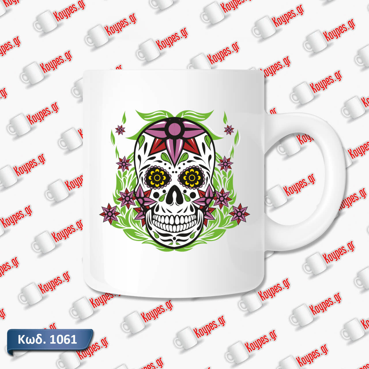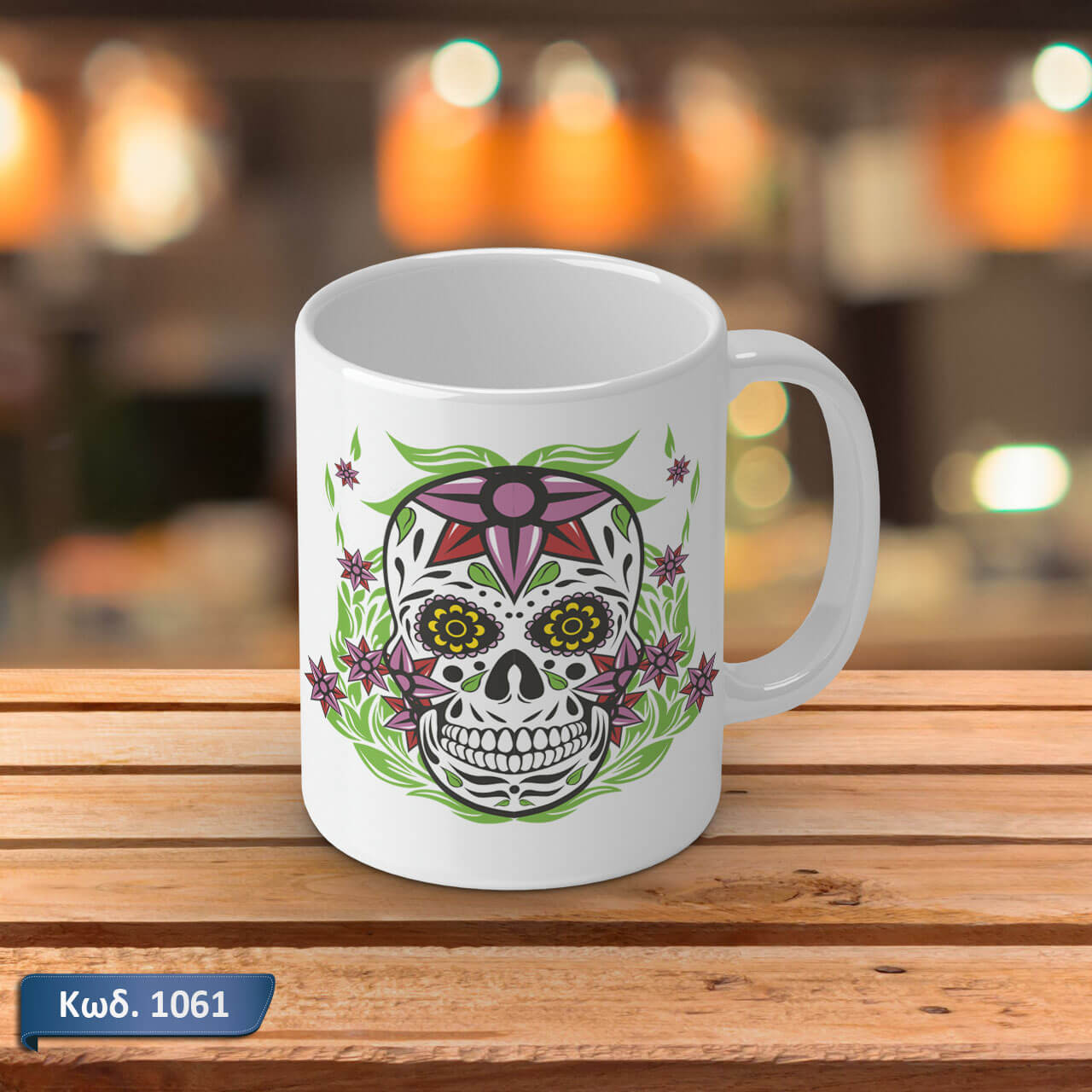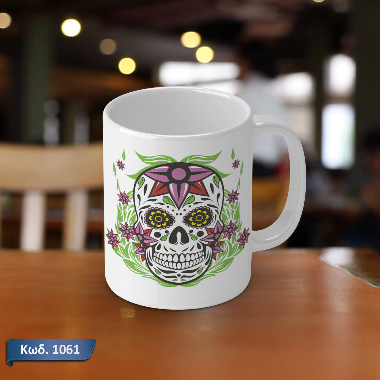 Κούπα με σχέδιο Νεκροκεφαλή με μωβ λουλούδια.